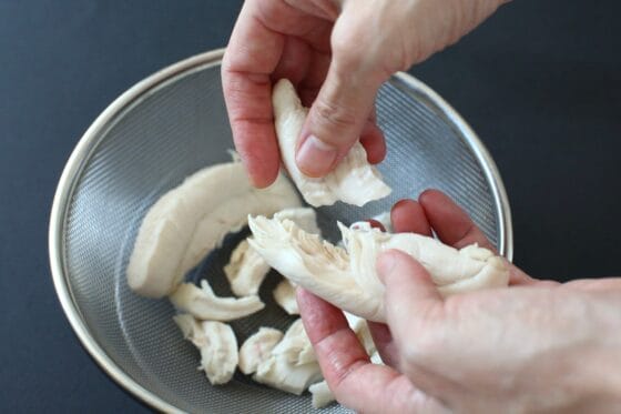 8分経ったらフタを取り、茹で上がったささみをザルに上げて水気を切ったら完成です。