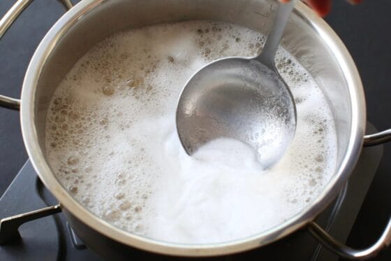 沸騰してアクが浮いてきたら、火を弱め、表面のアクを軽くすくい取ります。