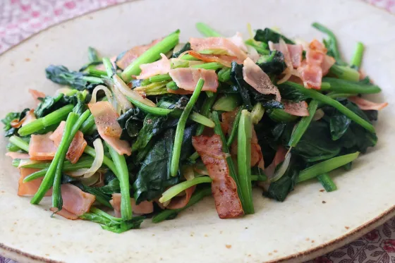 ベーコンの脂の旨みをいかし、野菜の持ち味を素直に楽しめるほうれん草ベーコンソテーです。