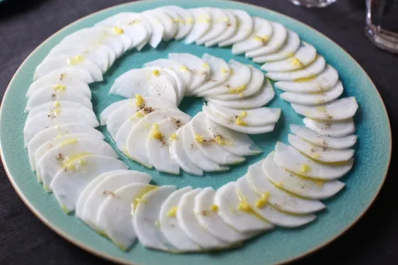薄切りにした生のかぶに、柚子の香りとオリーブオイルのまろやかさを合わせるだけ。