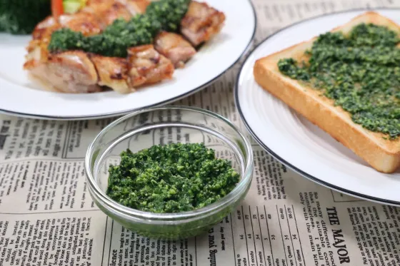 フードプロセッサーで材料を攪拌するだけで、鮮やかな緑色の万能ソースが簡単に作れます。