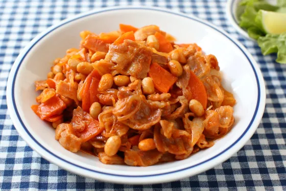 ポークビーンズといえば、給食や家庭料理でおなじみの、ケチャップ風味の甘辛い煮込み。