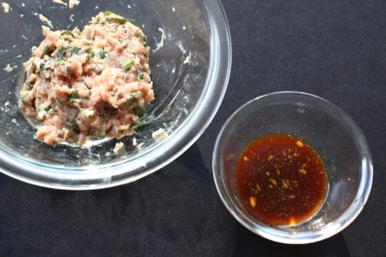 - ① ボウルに鶏ひき肉(150g)・大葉みじん切り(5枚分)・すりおろし生姜(小さじ1)・醤油(小さじ1)・塩(小さじ1/8)・片栗粉(小さじ1)を入れ、粘りが出るまで手でしっかり混ぜて肉だねを作ります。