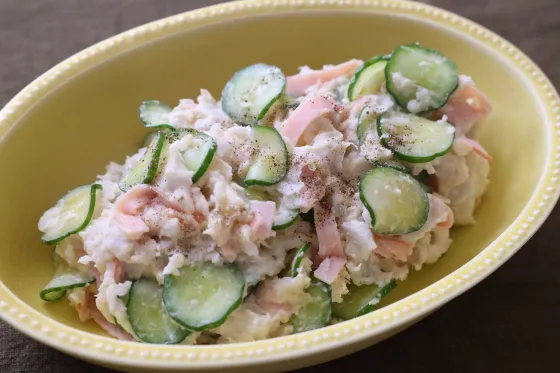 - ⑤ ほんのり温かい状態の里芋に、きゅうり・ハム・おろし生姜(小さじ1)・マヨネーズ(大さじ2:24g)・醤油(小さじ1/2)・砂糖(小さじ1/4)・塩(小さじ1/8)を加えて全体をやさしく混ぜます。