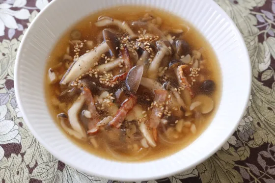 このスープはしめじの旨味を存分に味わうためにベーコン量を控えめにしているため、加える場合は少量にとどめるのがおすすめです。