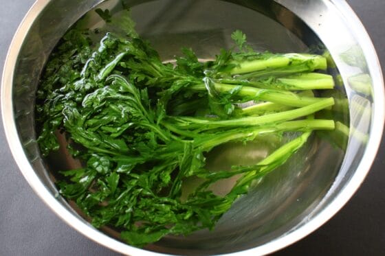 春菊の葉の部分を手で持ち、まず茎を30秒ほど茹でます。