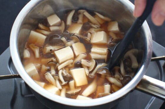 沸騰直前でしめじを加え、表面が静かにふつふつする程度の弱めの火力を保ちながら、2〜3分火を通します。