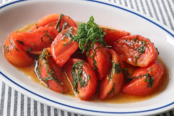 完熟トマトの甘みと大葉(しそ)の爽やかな香りが広がる、トマトと大葉のマリネレシピです。