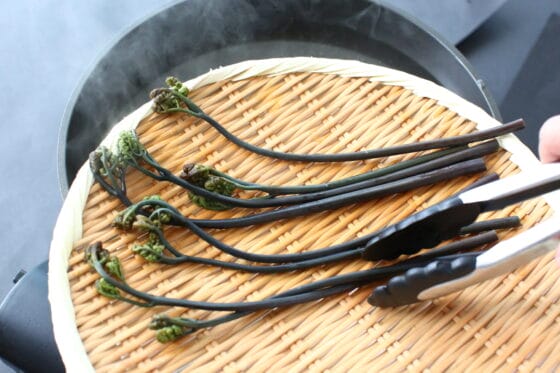 - ② わらびを熱湯でさっと1分ほど湯通しし、ザルに上げて水気を切ります。